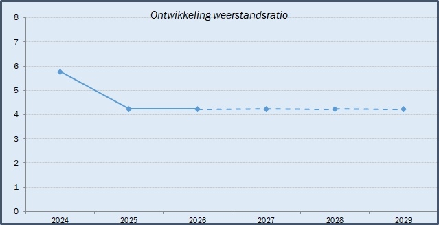 De onderstaande grafiek laat de ontwikkeling van de weerstandsratio zien, inclusief de prognose voor de komende jaren. Voor de prognose gaan we uit van gelijk blijvende benodigde weerstandscapaciteit. Voor de beschikbare weerstandscapaciteit gaan we uit van de meerjarenramingen.